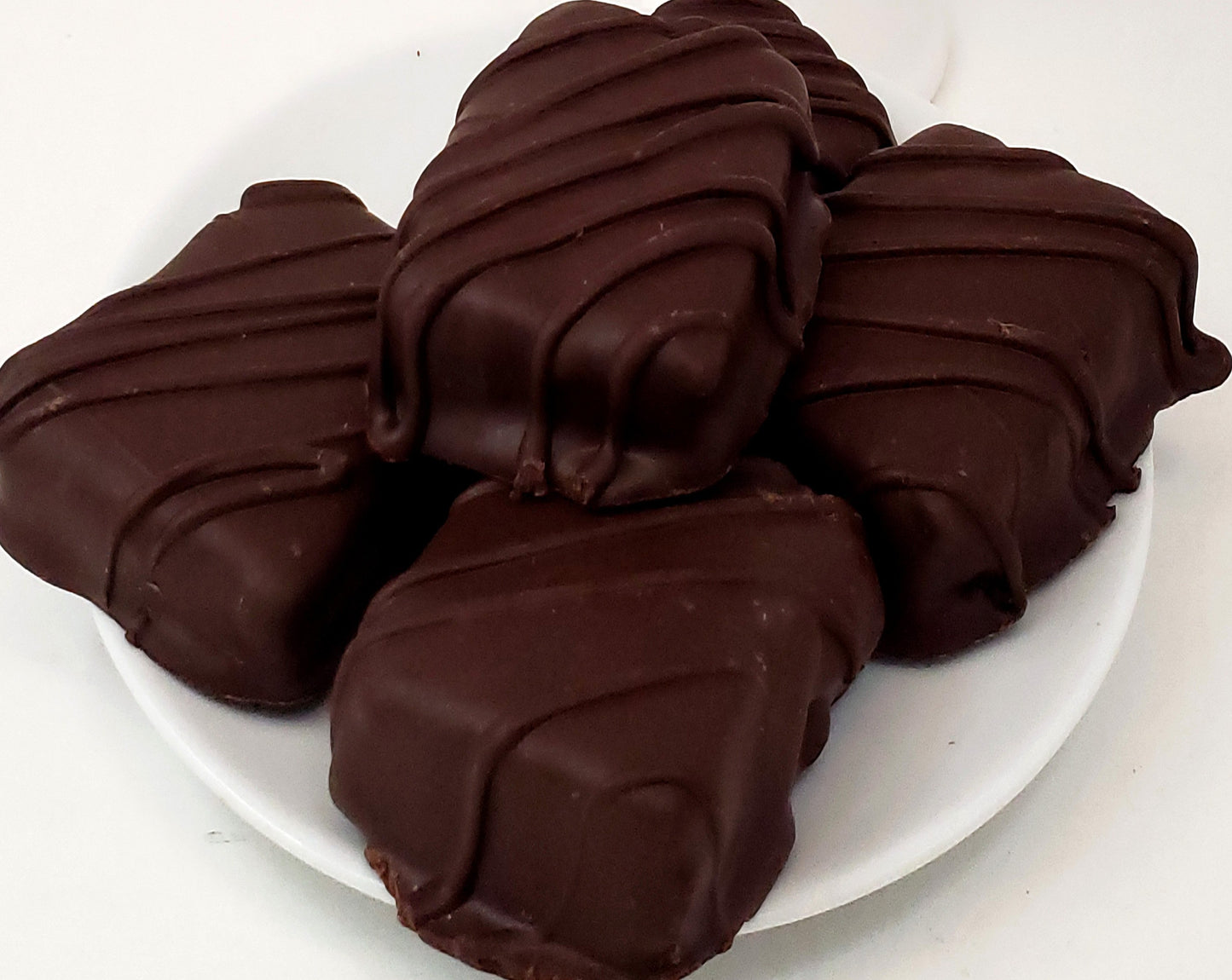 Our Original Classic Recipe Jane Parker Fruitcake enrobed in delicious milk, dark, or white chocolate. Each one of our classic fruitcake slices is hand dipped and enrobed in the most decadent, delicious chocolate. Once dipped, our enrobed slices are then hand decorated and drizzled with more chocolate, to add an additional level of individualized beauty to each slice. Each chocolate enrobed fruitcake slice is individually wrapped to ensure the freshest, best tasting chocolate covered fruitcake slice imaginable! Each rectangular slice is approximately 2 inches in length. These chocolate covered fruitcake slices make the perfect gift for birthday's, anniversaries, and holidays. Makes any special occasion even better. Makes the perfect gift for anyone who loves the great combination of delicious chocolate and fruit and nuts. 12 individually wrapped slices per order.